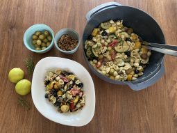Ein frischer Salat mit geröstetem Gemüse, Pasta, frischen Tomaten, Mozzarella und knackigen goldbraun gebratenen Pinienkernen verfeinert mit Balsamicocreme.