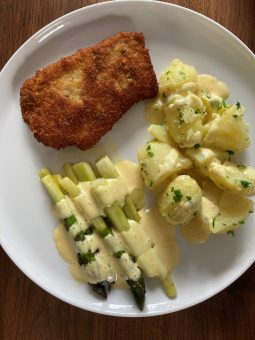 Dieses Rezept ist eine Hommage an die klassische deutsche Küche und vereint zarte Schnitzel, knackigen Spargel, herzhafte Salzkartoffeln und eine samtige Sauce Hollandaise zu einem …