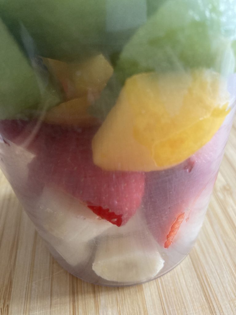 • Banane, Kiwi, Nektarinen schälen und in den Pürierbecher klein schneiden