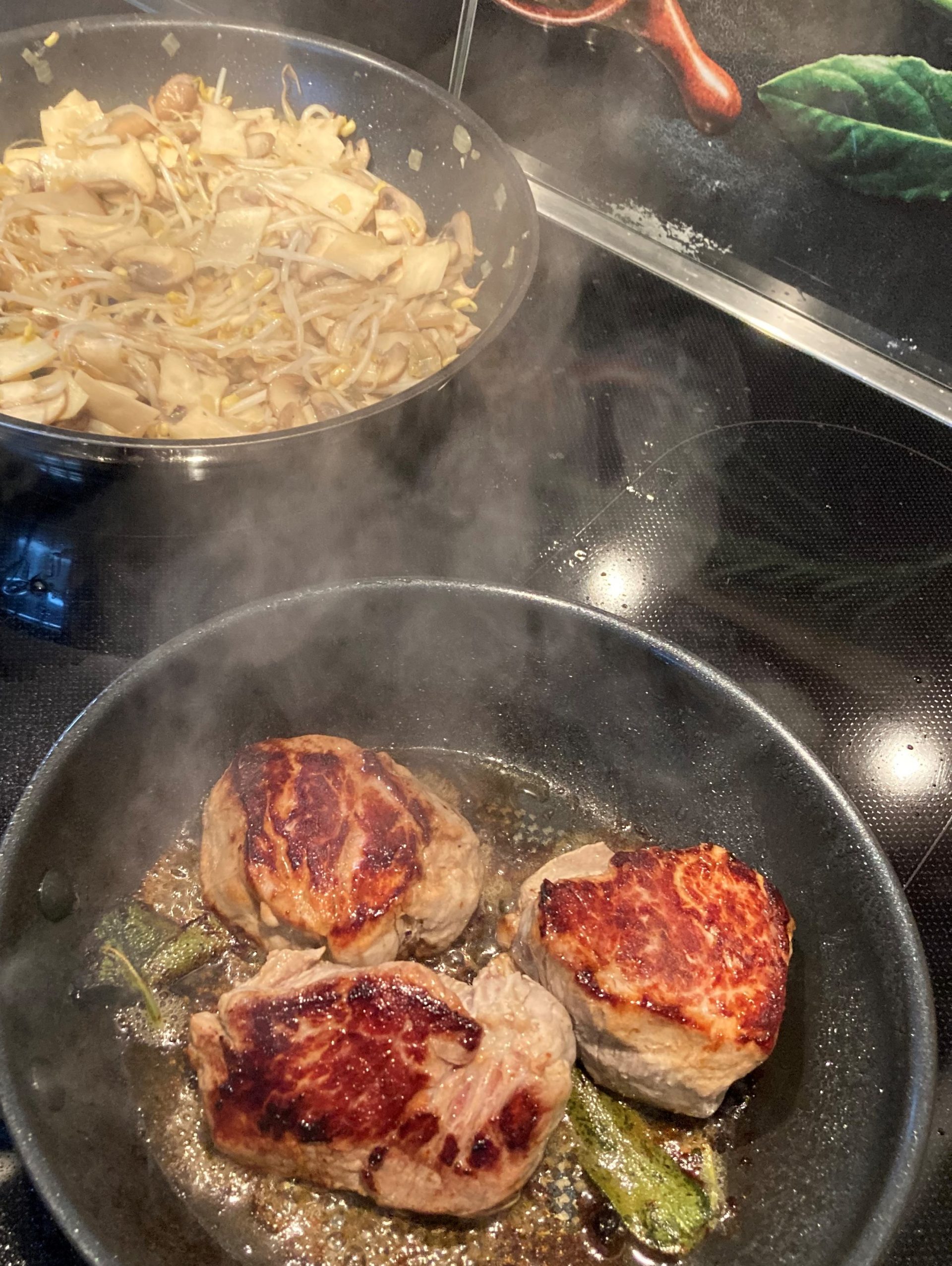 - Danach Temperatur auf die mittlere Stufe senken, Butter und Salbei hinzufügen und noch mal von jeder Seite 3-4 Min braten, wenn ihr bzgl. der Garzeit nicht sicher seid, macht einfach den Daumentest