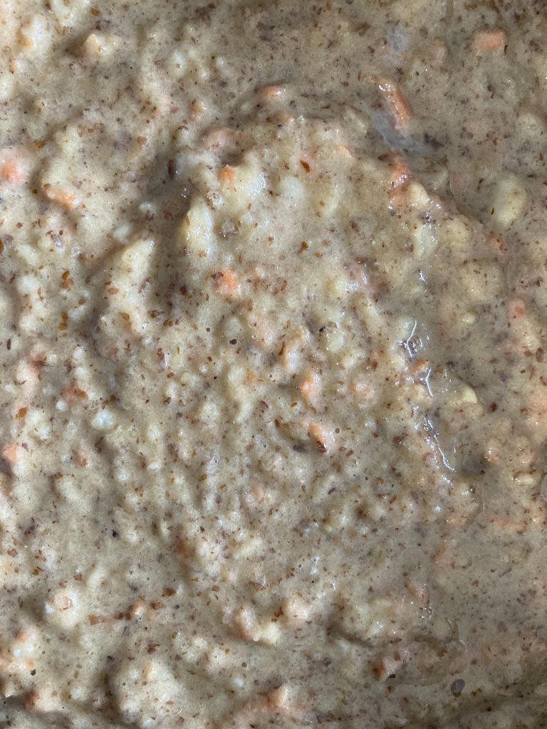 • Möhren und Apfel schälen, grob raspeln und mit der Prise Bourbon Vanille zu der Masse geben und vermischen