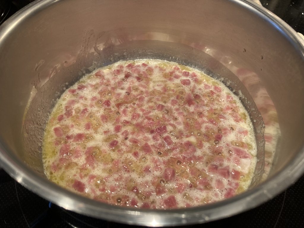 - Butter in einem Topf erhitzen und Schinkenwürfel darin auf mittlerer Stufe kurz anbraten