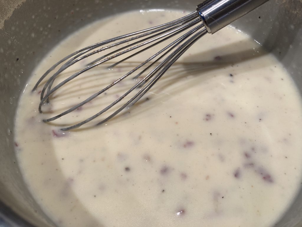 - 3 EL Mehl hinzufügen und mit dem Schneebesen einrühren