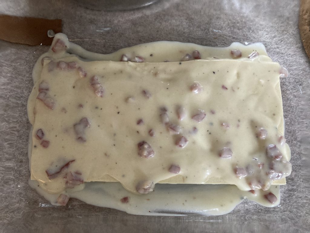 - Ein Lasagneblatt darauf legen und mit Bechamel bedecken