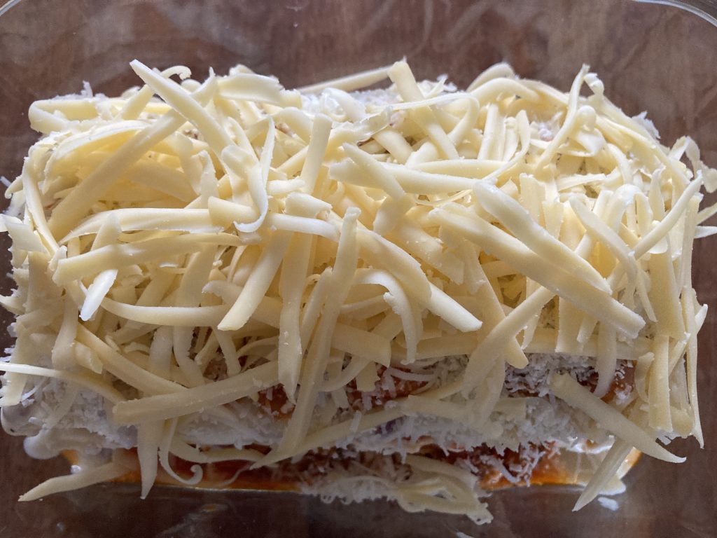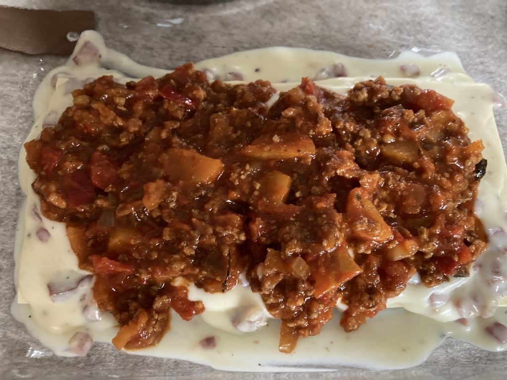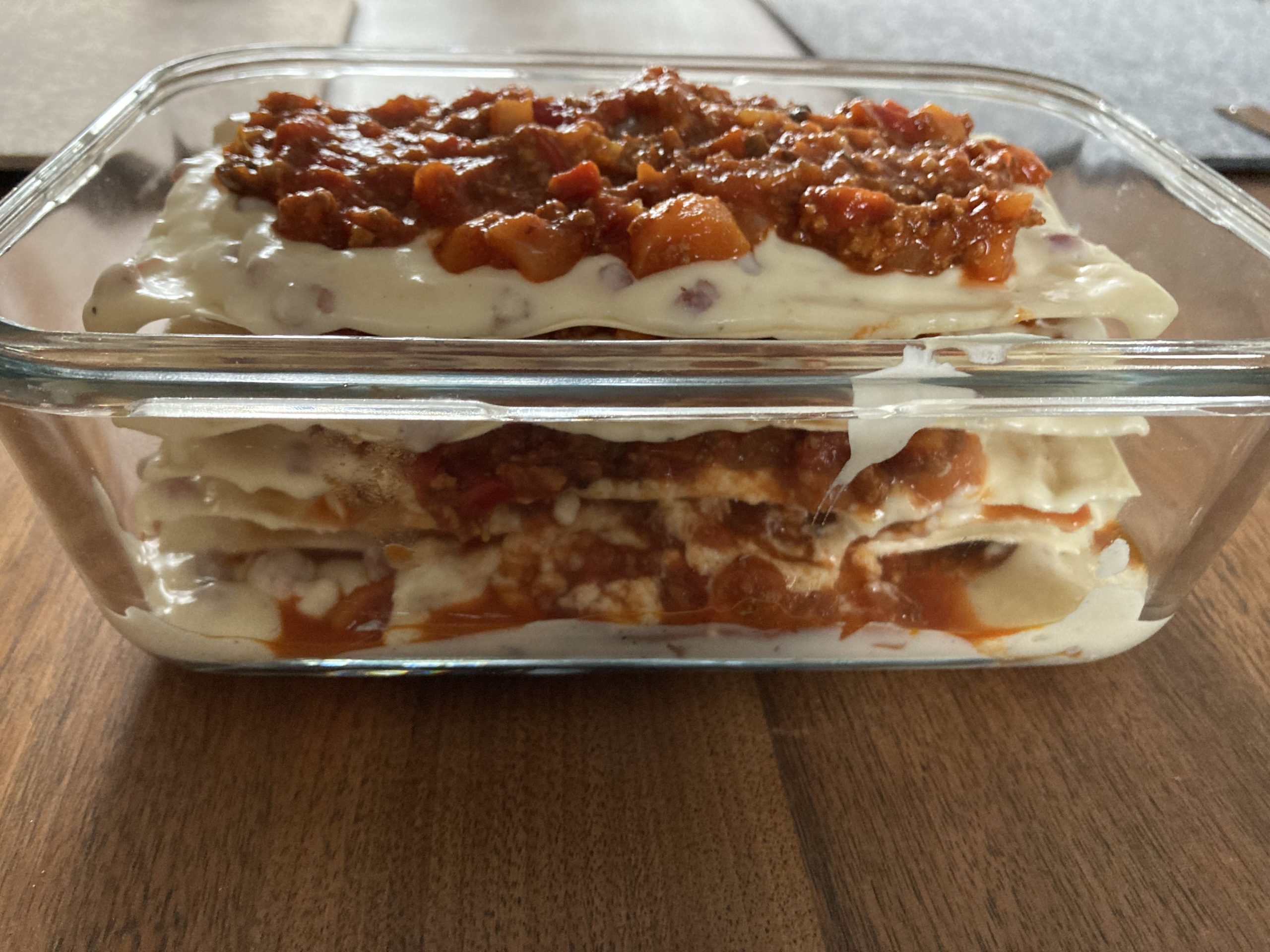 - Ein Blatt Lasagne Pasta drauf legen und die Schritte wiederholen bis die Zutaten aufgebraucht sind