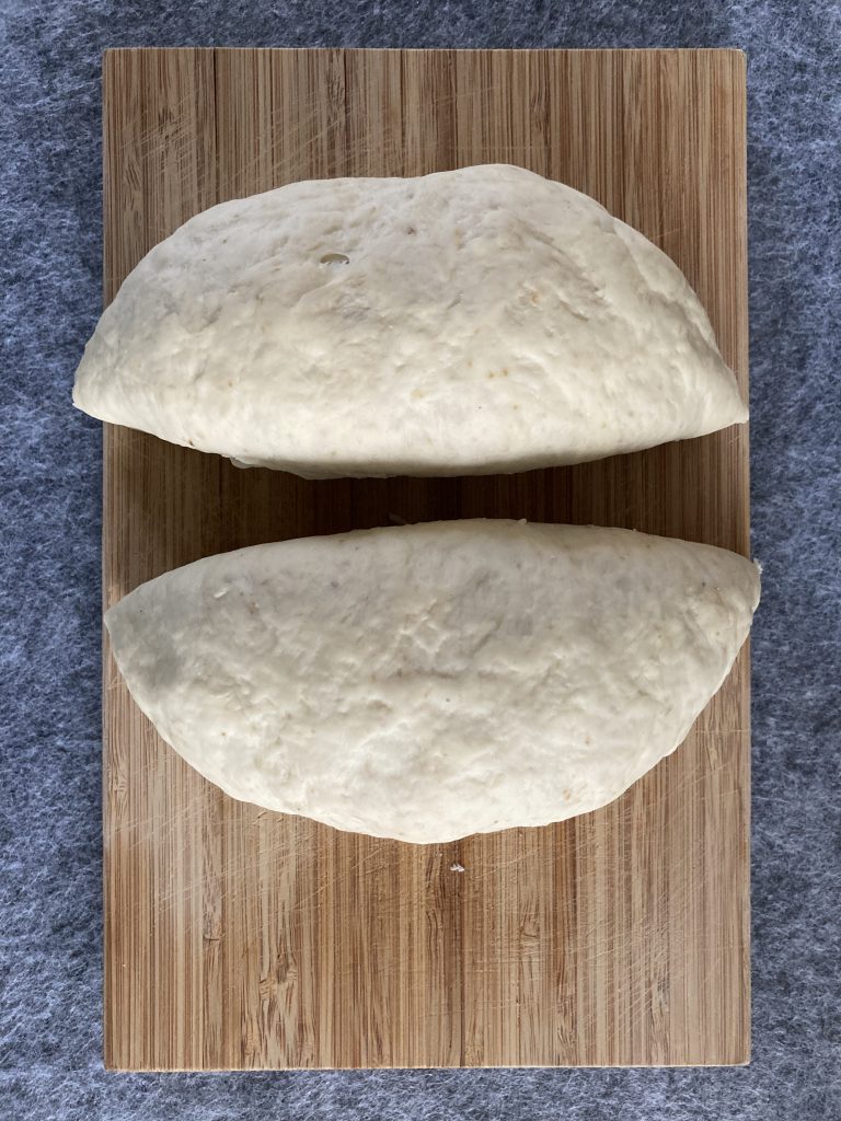 - Beide Hälften jeweils wieder zu einer flachen Kugel formen, in die Schüsselchen mit Olivenöl geben, abdecken und mind. 5 Std. aufquellen lassen (ggf. über Nacht im Kühlschrank)