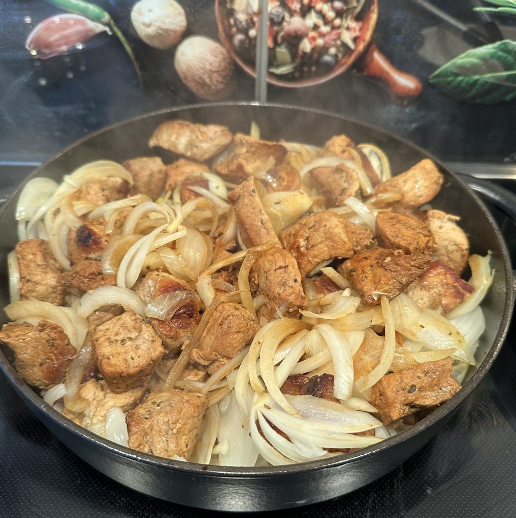 - 3 Gemüsezwiebeln schälen, in Ringe schneiden, zu dem Fleisch geben, gut vermengen und ca. 30 Minuten auf mittlerer Stufe schmoren – ab und an umrühren