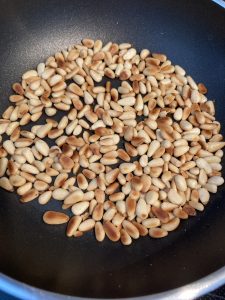 Pinienkerne in einer Pfanne ohne Fett goldbraun anrösten