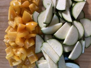 Paprika waschen, entkernen, von der weißen Haut befreien und in Stücke schneiden, Zucchini waschen, längs halbieren und in Scheiben schneiden