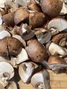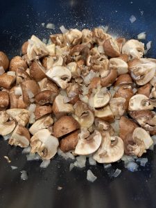 Danach Champignons hinzugeben und ca. 5-10 Min mitbraten bis die Champignons die eigene Flüssigkeit wieder aufgenommen haben