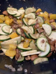 Nun Zucchini und Paprika dazugeben und ca. 5 Min unter häufigem Rühren mitbraten bis das Gemüse etwas weicher aber noch bissfest ist. Danach vom Herd nehmen und etwas abkühlen lassen