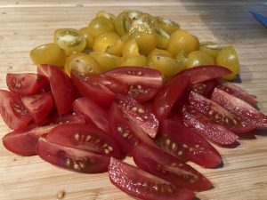 In der Zwischenzeit Cherrytomaten waschen abtropfen und längst vierteln