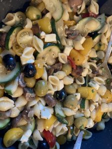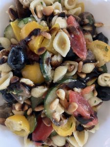 Nun Nudeln mit dem gerösteten Gemüse, den Cherrytomaten, Mozzarella, Oliven und der Vinaigrette gut vermischen. Mit den Kräutern und Salz & Pfeffer abschmecken
