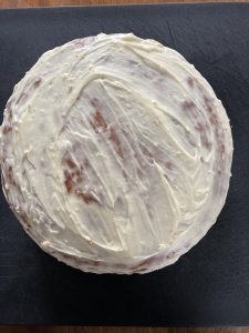 Creme auf den unteren Teil streichen, Kuchen zusammen setzen und den Rest der Creme oben drauf verstreichen