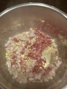 - Dann Zwiebeln und Knoblauch (und ggf.) Chilli) hinzugeben