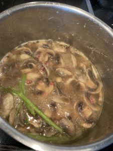 - Zwischendurch 2-3 mal schwenken und dann die Champignons hinzufügen und ca. 5min anbraten