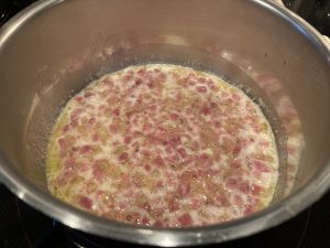 - Butter in einem Topf erhitzen und Schinkenwürfel darin auf mittlerer Stufe kurz anbraten