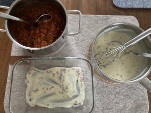 - Ein Blatt Lasagne Pasta drauf legen und die Schritte wiederholen bis die Zutaten aufgebraucht sind