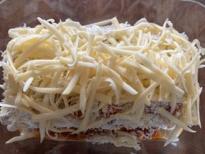 - Am Ende mit dem restlichen Parmesan und Gouda bedecken und für 25-30 Min bei 180 Grad Umluft in den Backofen geben