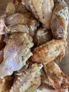 - Am besten am Abend zuvor die Hähnchenflügel zu Chicken Wings teilen (beide Stücke auseinander ziehen und am Gelenk mit dem Messer zerschneiden dabei evtl. etwas drehen), wie o.g. würzen, gut vermengen und kalt stellen