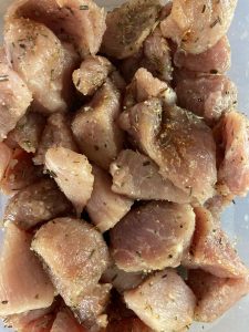 - Dann das Schweinefleisch (möglichst auch am Abend zuvor) würzen, gut vermengen und kalt stellen