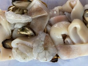 - Am besten am Morgen Meeresfrüchte (Mischung, Tintenfisch, Gambas) auftauen lassen