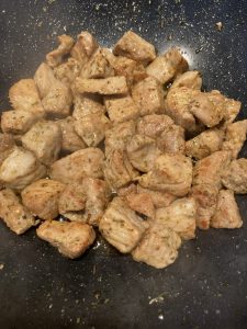 - 2-3 EL Olivenöl im Wok oder einer Pfanne stark erhitzen und Hähnchen darin unter häufigem Rühren goldbraun braten, rausnehmen und bei Seite stellen