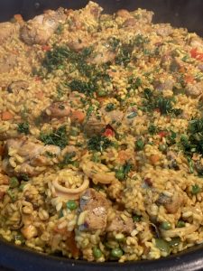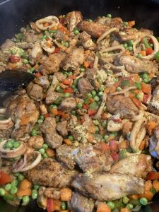 - Dann das Fleisch und die Meeresfrüchte (bis auf die Garnelen) hinzugeben, danach noch die Erbsen hinzufügen und alles wenige Minuten unter häufigem Rühren anbraten