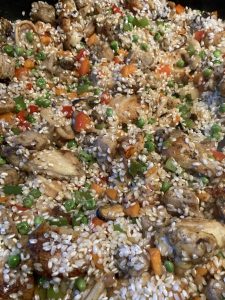 - Zwischendurch den Reis immer wieder vorsichtig etwas bewegen damit er gleichmäßig gar wird, abschmecken und ggf. nachsalzen