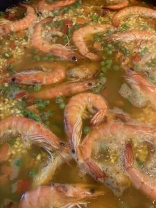 - Nun wird das Gemüsebrühe- und Hähnchenbrühepulver, sowie Colorante, Safran, etwas Salz und 1,25l Wasser hinzugefügt und die Gambas oben darauf verteilt, Küchenuhr auf 18 Min einstellen