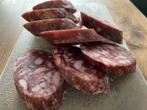 Salchichon (Dauerwurst) in ca. 1 cm dicke Scheiben schneiden, Schinken würfeln oder alt. eine Lage zusammenrollen und mit einem Rouladenspieß fixieren