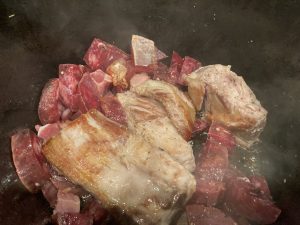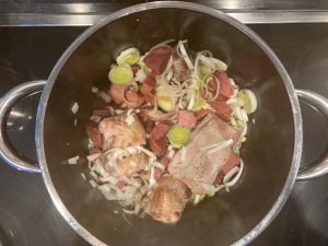 Rippchen in 2-3 Stücke teilen, mit dem Bauchfleisch, dem Salchichon und dem Schinken in einem großen Topf scharf anbraten