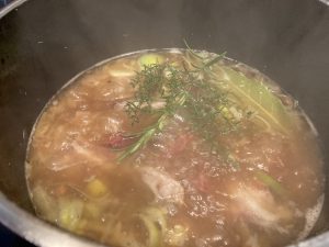 Nun Hitze reduzieren und Brühe, Lorbeer, Piment, Kräuter und so viel Wasser hinzufügen so dass das Fleisch gut bedeckt ist (ca. 3/4 l), aufkochen und 20 Min auf kleiner Stufe köcheln lassen