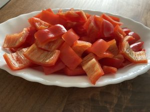 Paprika entkernen und in Stücke schneiden, Bohnen waschen und in mundgerechte Stücke schneiden