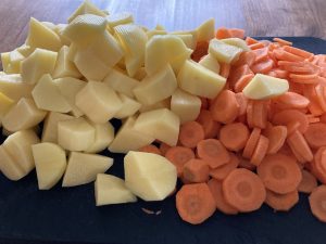 In der Zwischenzeit Kartoffeln schälen und in Würfel schneiden, Karotten schälen und in Scheiben schneiden