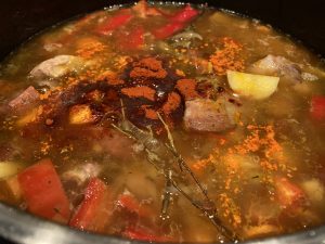 Das Ganze noch mal für 25-30 Min köcheln (Wer den Paprika und die Bohnen etwas bissfester mag, fügt dies erst 10 Min vor Ende der Kochzeit hinzu)