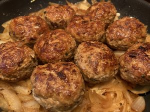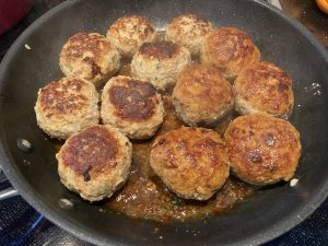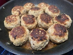 Wenn die Frikadellen etwas dunkler geworden sind, nun kommt der spezielle Trick: mit Bier ablöschen und nach kurzer Zeit wenden so dass die Frikadellen von beiden Seiten diese schön goldbraune Farbe annehmen (s. rechts auf dem Foto)