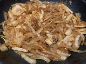 In der Zwischenzeit Gemüsezwiebel in Streifen schneiden