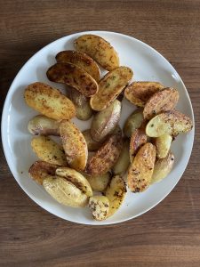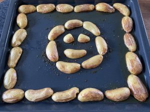 - Kartoffelhälften mit der offenen Seite nach unten auf dem Blech (wo es gewürzt ist) verteilen