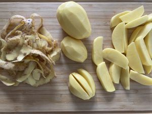 - Kartoffeln schälen und in Spalten schneiden (dabei darauf achten dass die Spalten etwa gleich groß sind)