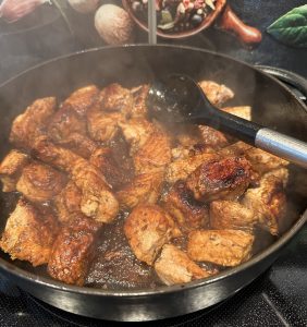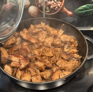 - Nun sollten sich die Röstaromen vom Boden lösen und das Fleisch eine schöne goldbraune Farbe annehmen, Hitze etwas runterstellen, Deckel auflegen und paar Minuten schmoren