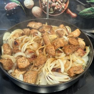 - 3 Gemüsezwiebeln schälen, in Ringe schneiden, zu dem Fleisch geben, gut vermengen und ca. 30 Minuten auf mittlerer Stufe schmoren - ab und an umrühren