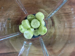 Gurke schälen, in grobe Stücke schneiden und in den Mixer geben